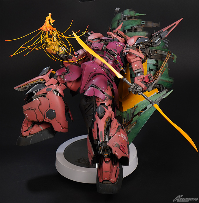 「あらゆる角度からみて楽しめる作品」というビルダーのコメントがあったように、隙がない作品。とくにビビットなピンクの発色が非常によく出ている。本体の完成度もさることながら、スクラッチで作成されたベースもお見事。さらに上を目指すなら、ジオラマの大きさを調整する、電飾を採用するなど、MSを主役に据えるような構図にすると良いのではないかと思う。
