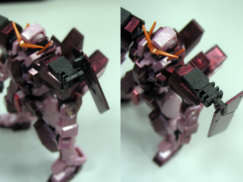 ▲この写真のように肩パーツにはいくつかの溝と穴があり、GNシールドやライフルを装着します。