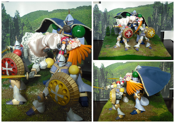 ジオラマ初挑戦の作品でありながら、各部のウェザリングや、精密に作られたベースがリアルさを保持しつつも、“王と王女とその従者”ではなく“王女とそれを守る三銃士”であるという設定をもとに、ギャンの鮮やかな緑・黄・赤のカラーリングや、お姫様の着る衣装がどこか童話的で、楽しげに感じられました。