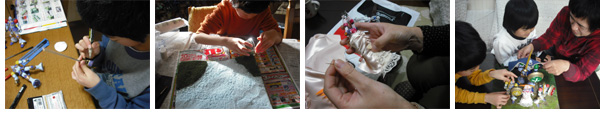 ガンプラはサンタさんとおばあちゃんからのプレゼントです。6歳年長の子供にとって、初めてのプラモデル組み立てでした。子供一人で説明書とにらめっこしながら、1体につき4時間ほどかかって、3体すべて組み立て完成。スミ入れは、おとうちゃん初挑戦でしたが、そこそこの出来具合。