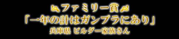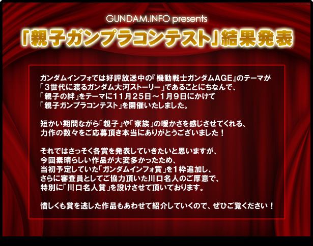 高度なテクニックを用いた作品や、面白いアイデアが盛り込まれた作品など、 趣向を凝らした作品を多数ご応募頂き、本当にありがとうございました。 まだ手の小さいお子さんたちが、びっくりするようなテクニックを持っていることに 編集部一同驚嘆いたしました。 そして、なにより今回はどの作品からもご家族でガンプラを楽しんでいる様子が伝わってきて、 できれば全ての作品に賞を差し上げたいという気持ちをおさえることに大変苦労いたしました。 あらためてすべてのご応募いただいた方々に感謝いたします。 ガンダムインフォでは今後もガンプラコンテストの開催を、ぜひ続けて行きたいと考えております。 その際は、また皆様からのご応募を心よりお待ちしております。 今後ともガンプラを、そしてガンダムインフォをどうぞよろしくお願いいたします。 最後に今回ご参加頂いた皆様、ならびに審査員としてご協力頂いたバンダイホビー事業部の川口名人、 そして告知にご協力頂いた「電撃ホビーマガジン」、「月刊ホビージャパン」編集部の方々に、 重ねて厚く御礼申し上げます。