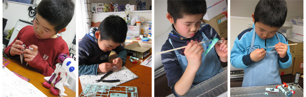 父がガンプラを造るのを知っていましたが、自分達で作る事は今回が初めての息子達。組み立ては説明書の読み方から、ニッパーの持ち方などに気をつけて組立て、塗装は自分達がどんな風に塗りたいかデザインを考え塗装。筆塗りなので塗料の濃さを注意させました。今回は兄弟で参加していますが弟(6歳)は真っ青なジム。聞いたらブルーディスティニーだそうです。2人とも、一連の作業で出来上がった作品に大満足でした。