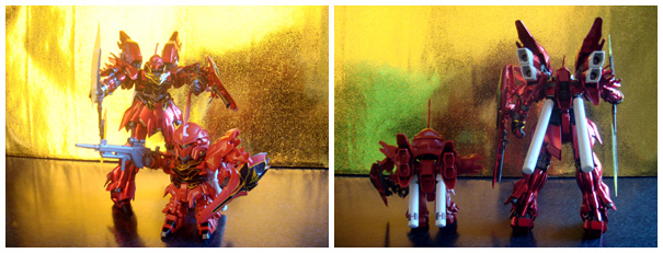 親子の絆をテーマに考え、親子と言えば血のつながりなので、血の色である赤をベースに作成しようと考えました。そして赤のMSで一番大好きなシナンジュ親子をイメージして作ってみました。ガンプラは始めたばかりなので、切り口を残さないことと、シールがたくさんあって細かい部分を貼るのに苦労しました。