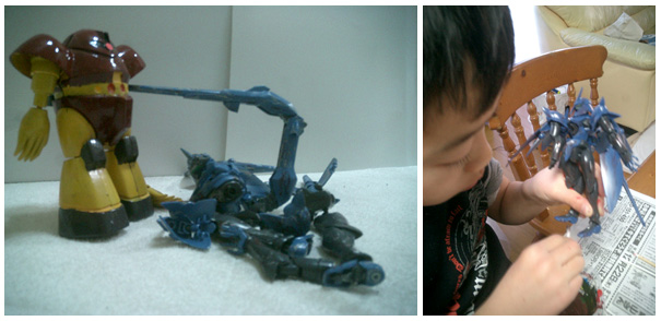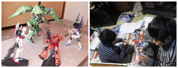 また、カメラへ向けて得意げにガンプラを向けるお兄ちゃんや、一生懸命になってAGタイタスを組み立てる弟くん、ベアッガイで顔を隠すお母さん、そして一人だけ早くアリオスを組み上げてしまって、カメラを片手に写真を撮って回るお父さんなど、写真の1枚1枚からその楽しげな情景が、ヒシヒシと伝わってきました。 皆で楽しめてよかったですね、お父さん! 我々の目からも思わず汗が…。