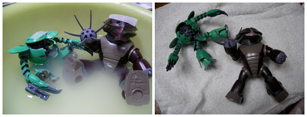 母が今回初めてガンプラを作り、完成した後2日ほど肩と腕が痛いといっていました。ガンプラを湯に入れるとき、プラスチックなのでどうしても浮かんでしまい、固定するのが大変でした。作るときに中におもりを仕込んでおけば良かったと学びました。