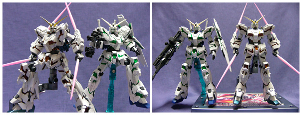 パパ=目消し、スミ入れ、パテ制作。子供=組み立て、サーフェイサー、塗装。こだわりは写真のとおり夜に光り輝くパンダです。ルミパウダーや蛍光塗料を吹きつけた発光サーベル仕様。いつもは原作に忠実なガンプラを作っている我が子が、始めて知恵を出し、笑いながら楽しく製作しました。3歳からガンダム命の我が子です。8歳になった今ではRGを素組ではなく完璧に作ります。ぜひ、御評価願います。