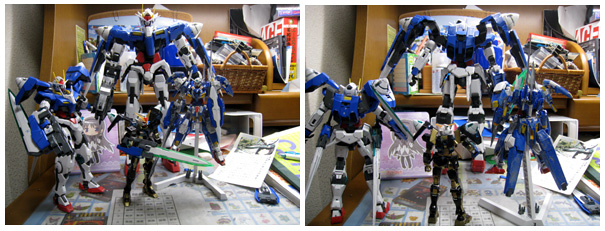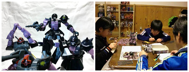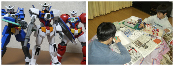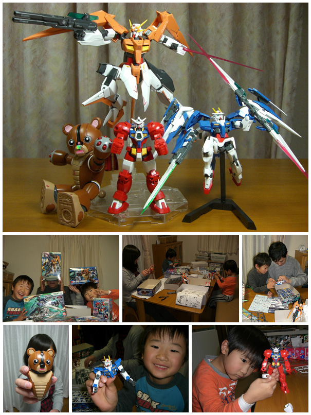 父親00(PG)、長男(MG)、次男(HG)→反抗期の髪染めなどを色変えで再現、頭部は「HG ビギニング」に差し替え、染めに失敗したのを再現(ところどころ塗っていない)。三男(HG アヴァランチエクシア)→外で遊んでボロボロになって帰ってくる様子を再現。