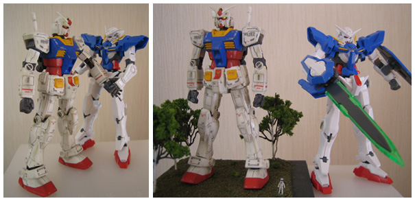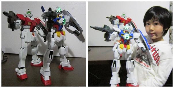 レオはガンダムAGE-1 ノーマルということでパパはそれにあわせて、ジムにしました(レオが5歳のときに初めて作ったメガサイズ ガンダムにちょこっと手を加えました)顔の部分はすこし苦労しました、レオは歌を歌いながら作っていたため、よくポリキャップをつけ忘れ、何度もはずす作業だけは手伝いました。タイトルはいまだに良いものが浮かびません。