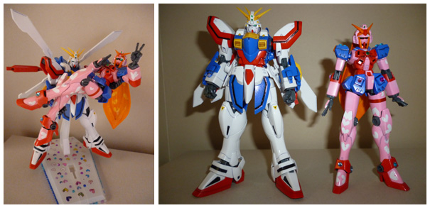 ゴッドガンダムはほぼ素組で、成型色を生かした部分塗装で作成。ノーベルガンダムは娘の初ガンプラ製作なので、パーツ切り出しは親が、組み立ては娘が行いました。塗装に関しては、ランナー状態でのスプレー吹付前にハートシールでマスキングを施し、乾燥後はがしてハートマークを入れました。その後、デコシールを娘が貼って完成させました。2人で楽しく製作できたと思います。