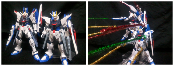 娘の大好きなフリーダムガンダムを作成しました。父はRG、娘はHGを担当。頑張って切り口を綺麗に作りました。そして、フリーダムと言えばフルバースト!!派手な射撃を再現するため、ラメモールを使いました。インパクトのある射撃が出来て、娘も大変喜んでます。