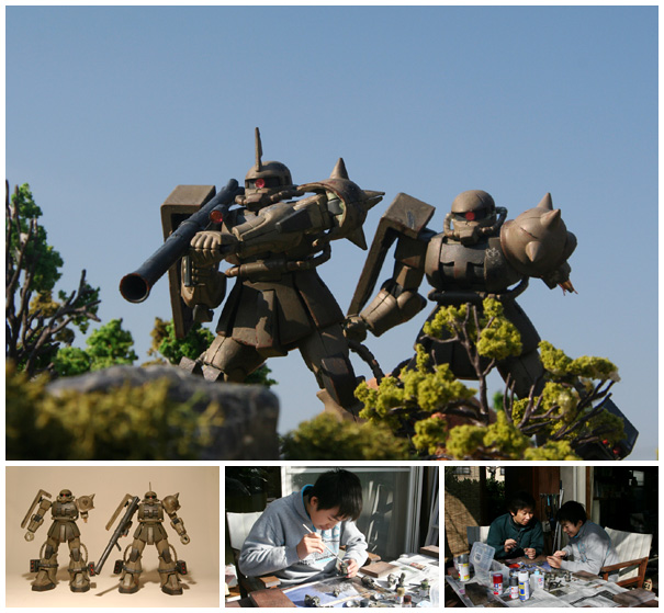 2011年の8月から親子でガンプラを始め、最初は素組で満足していましたが、息子が塗装やダメージ表現にこだわるようになり、仕上げたはじめてのザクです。ザク1体の腕が無いのは、制作途中でパーツが折れてしまい、苦肉の策として破壊された設定にしたためです。息子の別のプラモデルのパーツ等を流用してつくりました。本体だけでなく、ジオラマも制作し、戦闘シーンも再現しています。