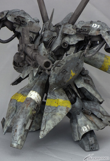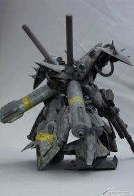 重量感あふれる絵画的な仕上がりやミリタリー風の渋い配色に、ベテランモデラーの風格を感じます。また、各所に取り付けたミキシングビルドのパーツが、全体のシルエットをいい意味で怪物じみた形にしているのも見どころでしょう。さらに、各部の大サイズ装甲のフラット感と、ファンネルやインテークなどの細かいパーツのリズムが小気味よく、情報密度の点で見ていて飽きない一作になっています。(電撃ホビーマガジン編集部)