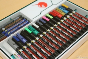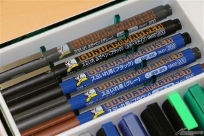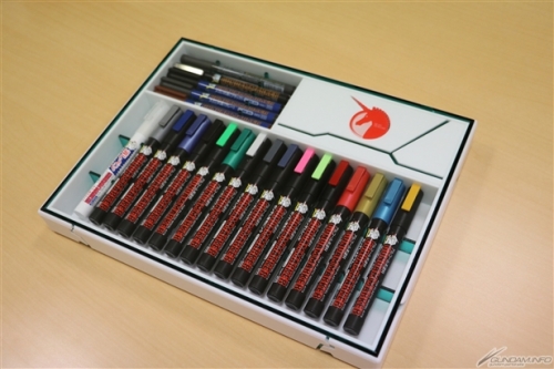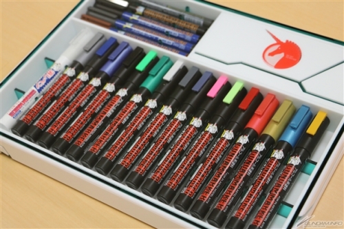 ▲こちらが景品の「ガンダムUC スペシャルマーカーセット グリーンフレームVer.」。ユニコーンの「ビスト財団ロゴ」が入った専用ケース内に、ガンダムマーカー全16色と、スミ入れペン5種、消しペン1本の計22本が収納されている。
