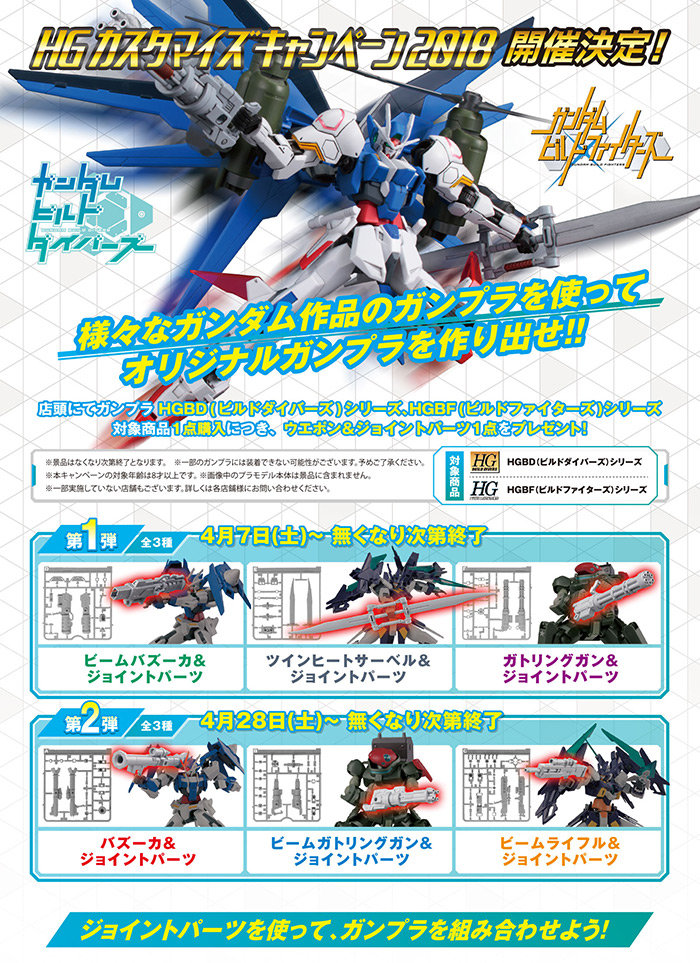 対象ガンプラは「HGBD(ビルドダイバーズ)」シリーズと「HGBF(ビルドファイターズ)」シリーズで、対象ガンプラを1点購入するごとに、ウエポン&ジョイントパーツが1点プレゼントされる。