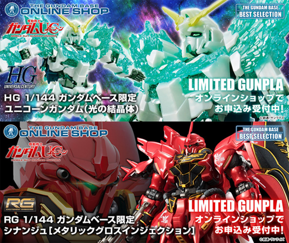 プレミアムバンダイのガンダムベースオンラインショップにて好評予約受付中の、ガンダムベース限定アイテム「HG ユニコーンガンダム(光の結晶体)」と「RG シナンジュ[メタリックグロスインジェクション]」、「SDガンダムBB戦士」関連キット7点は、11月5日(月)23:00で受付終了となる。いずれも、11月14日(水)発送予定。