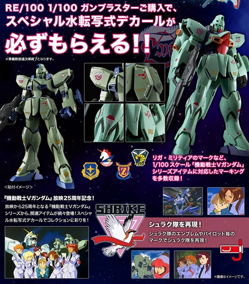『機動戦士Vガンダム』より、ガンイージの強化発展型機ガンブラスターがRE/100で立体化。特徴的なブースター・パックを新規造形で、機体カラーは成形色で再現。さらに、ビーム・シールド表面ビーム粒子の波紋はプリントで再現されている。また、ビーム・ライフル、ビーム・サーベルほか各種武装に加え、マーキングシール、ホイルシールが付属する。