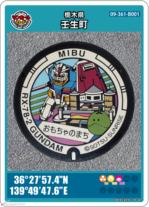 本カードは、壬生町に寄贈・設置されている「ガンダムマンホール」をデザインしたカードで、マンホールは日本一かわいい駅名に選ばれた「おもちゃのまち」駅の東口に設置してある、壬生町のオリジナルデザインとなっている。近くにお住いの人は、この機会にぜひ足を運んでみよう。
