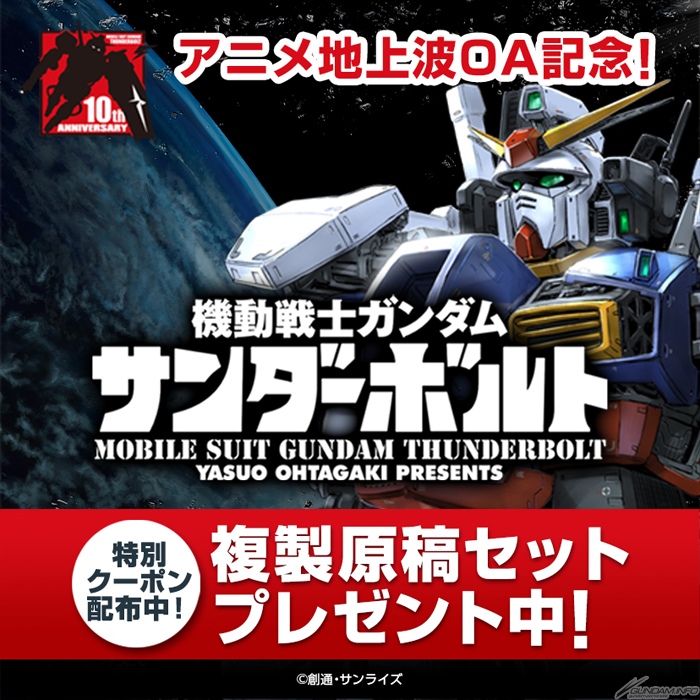小学館公式通販サイト「LIFETUNES MALL」で、「機動戦士ガンダム サンダーボルト」のグッズを購入した人に、「複製原稿3枚セット」がプレゼントされる。