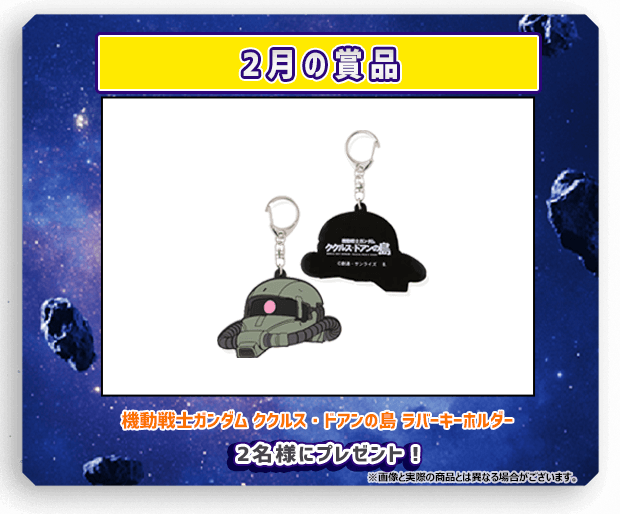 2月28日(火)までに投稿した人の中から2名に、賞品として「『機動戦士ガンダム ククルス・ドアンの島』ラバーキーホルダー」がプレゼントされる。