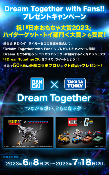 Twitterで、魂ネイションズ公式アカウント(@t_features)をフォローし、ハッシュタグ「#DreamTogetherCP」をつけて「コラボプロジェクトに期待すること」を投稿すると応募完了。抽選で50名に「トミカ×機動戦士ガンダム」や「超合金 RZ-041 ライガーゼロ」といった豪華コラボプロジェクト商品がプレゼントされる。