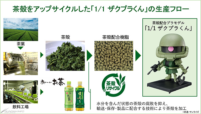 「1/1 ザクプラくん」は、1商品あたり「お~いお茶 緑茶」600mlペットボトル約2本分の生産に使用する茶殻を配合した、ほのかにお茶の香りがするプラモデル。