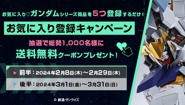 また、「お気に入り商品登録キャンペーン」では、ガンダムシリーズの商品を5つ以上お気に入り登録すると、抽選で1,000名に送料無料クーポンがプレゼントされる。