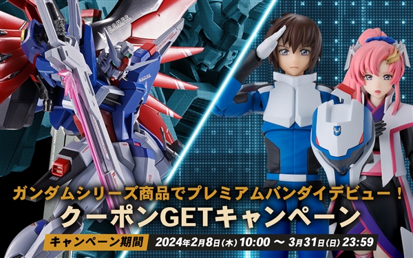 プレミアムバンダイにて、「ガンダムシリーズ商品でプレバンデビュー!クーポンGETキャンペーン」と「ガンダムシリーズお気に入り商品登録キャンペーン」が好評開催中だ。
