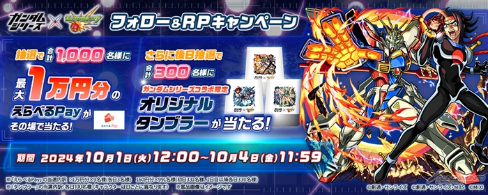 モンストキャンペーン公式Xアカウントをフォローし、対象の投稿を期間内にリポストすると、即時抽選で合計1,000名に最大1万円分の「えらべるPay」が、後日抽選で合計300名に「ガンダムシリーズコラボ限定オリジナル タンブラー」が当たるキャンペーンが開催される。