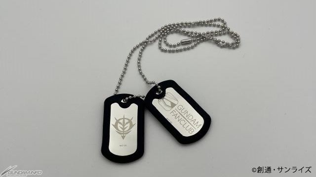 贈呈される「特製ドッグタグ」はダブルプレート(2枚セット)となっており、1枚目は表面に会員の「名前&会員番号」、裏面に「希望するエンブレム」を刻印。2枚目は「ガンダムファンクラブのロゴ」が刻印される。