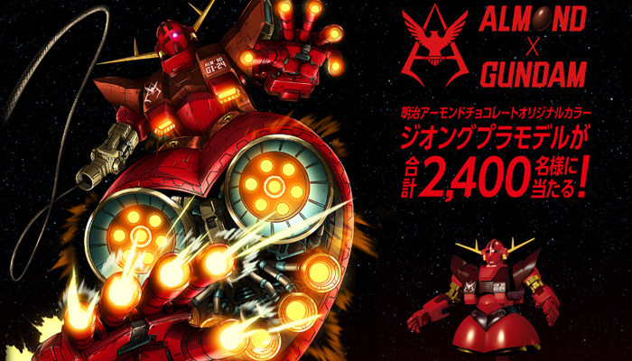 本キャンペーンは、対象商品2点以上の購入レシートを1口として応募すると、抽選で合計2,400名に、「明治アーモンドチョコレート オリジナルカラー ジオングプラモデル」が当たるというもの。