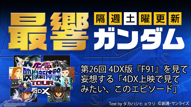 公式アプリ「ガンダムファンクラブ(GFC)」では、心に“最も響いた”ガンダムを語る【最響ガンダム】第26回「4DX版『F91』を見て妄想する『4DX上映で見てみたい、このエピソード』」が、本日11月28日(土)に公開された。