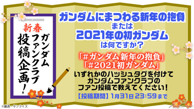 2つのお題からお好きな方、または両方のハッシュタグ「#ガンダム新年の抱負」「#2021初ガンダム」を付けて‟ファン投稿”に投稿しよう。投稿期間は、1月31日(日)23:59まで。