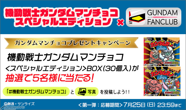 GFCよりお題として出された3種のシールから”どれか1種”を当てて、「ファン投稿」でハッシュタグ「#機動戦士ガンダムマンチョコ」をつけて投稿した人の中から抽選で5名に、「機動戦士ガンダムマン チョコ<スペシャルエディション>BOX(30個入)」がプレゼントされる。