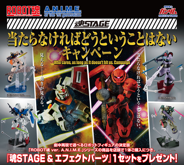 本キャンペーンは、「ROBOT魂 ver. A.N.I.M.E.」シリーズ商品を店頭で1体購入するごとに、「魂STAGE&エフェクトパーツセット」(1セット)がもらえるプレゼントキャンペーン。