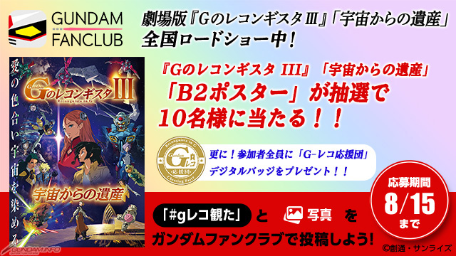 公式アプリ「ガンダムファンクラブ(GFC)」では、本日7月22日(木・祝)より劇場版『Gのレコンギスタ III』「宇宙からの遺産」が公開されたことを記念して、「キービジュアルB2ポスター」をプレゼントする企画がスタートした。