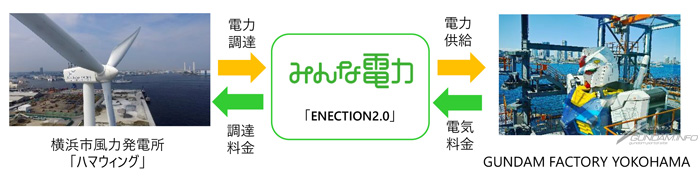 “18mの実物大ガンダムを動かす”という夢の実現を体感できる施設「GUNDAM FACTORY YOKOHAMA(GFY)」では、5月より、横浜市風力発電所「ハマウィング」で発電した電力の供給を実施している。