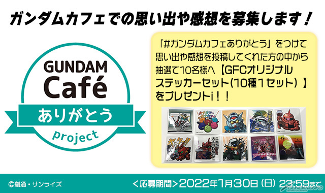 本投稿企画は、本日よりガンダムカフェ各店にてスタートした「GUNDAM Café ありがとうproject」の感想や、これまでのガンダムカフェでの思い出を、GFC内の「ファン投稿」で募集。投稿する際は、ハッシュタグ「#ガンダムカフェありがとう」をつけることが必須となっている。