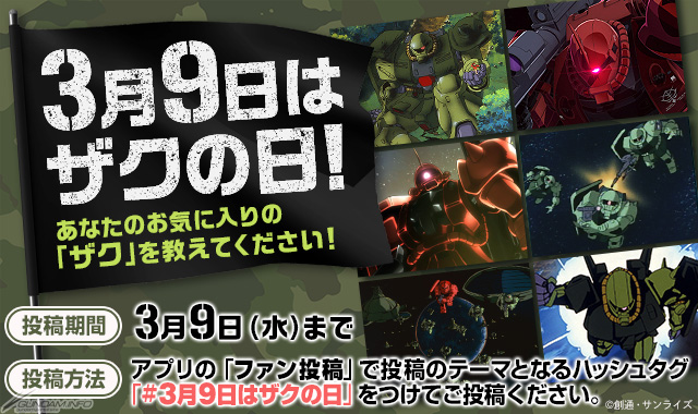ザクに関することであれば内容は自由となっており、動画のシーンを一緒に投稿できる「シーン投稿」での投稿も受け付けている。投稿期間は3月9日(水)23:59まで。