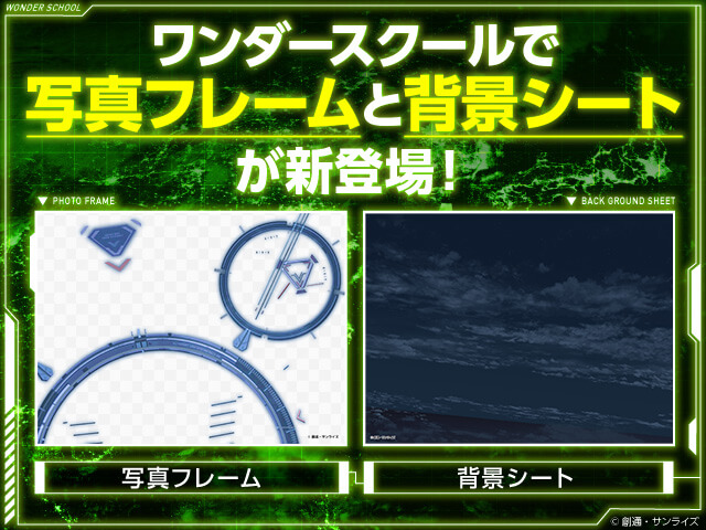 バンダイによる無料で動画やコンテストが楽しめる投稿サイト「WONDER!SCHOOL(ワンダースクール)」公式アプリでは、写真フレーム&背景シート「クスィーガンダムvsペーネロペー」が新たに追加された。