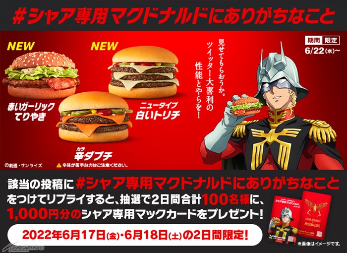 内容:マクドナルド公式Twitterアカウント(@McDonaldsJapan)をフォローし、同アカウントから投稿された「#シャア風食レポ選手権」のハッシュタグが付いたツイートに「#シャア専用マクドナルドへようこそ」を付けてリプライしよう。