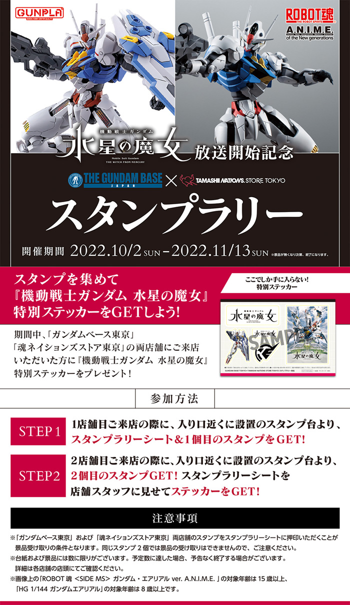また、ガンダムベース東京との連動イベントは、両店舗に足を運びスタンプを集めることで、「『水星の魔女』特別ステッカー」がもらえる“スタンプラリー”となっており、10月2日(日)よりスタートする。