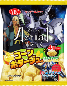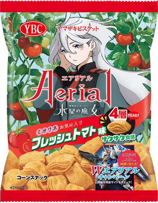 ヤマザキビスケットが展開するスナック菓子「Aerial(エアリアル)」と『機動戦士ガンダム 水星の魔女』によるコラボパッケージは、本日12月5日(月)より、「ミオリネお気に入りフレッシュトマト味」を発売する。