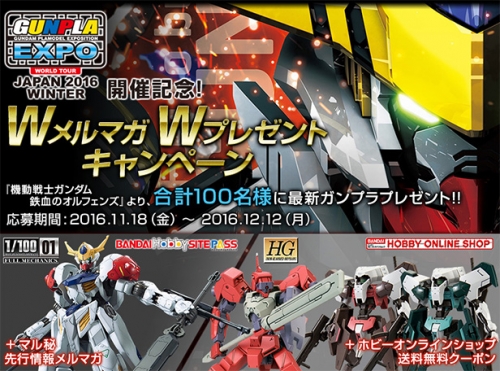 キャンペーンは、いよいよ明日11月19日(土)から東京・秋葉原UDX アキバ・スクエアにてスタートするガンプラ最大の祭典「ガンプラEXPO ワールドツアージャパン 2016 WINTER」の開催を記念するもの。「ガンダムショッピングニュース」と「ホビーサイトパス」の2つのメルマガに、それぞれプレゼントが用意されている。