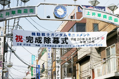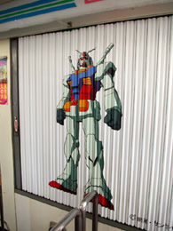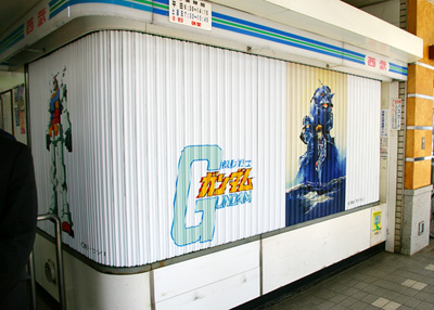 銅像設置のほか、上井草駅では23日(日)始発電車より、発車ベルが「機動戦士ガンダム」のテーマソング「翔べ!ガンダム」になりました。また、下り線改札口を出て左手にある駅売店のシャッターもガンダムの図柄になりました。
