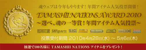 『TAMASHII NATIONSアワード2010 ~選べ、魂の一等賞!年間アイテム人気投票~』と題されたこのアンケートでは、2009年4月1日~2010年3月31日にコレクターズ事業部から発売された全てのアイテムの中から、5つの部門に分かれて至高のアイテムをユーザー投票で決定。