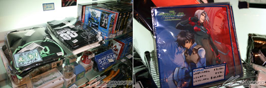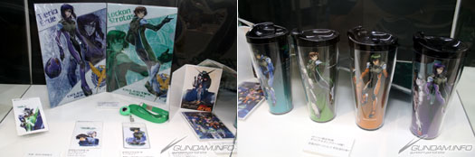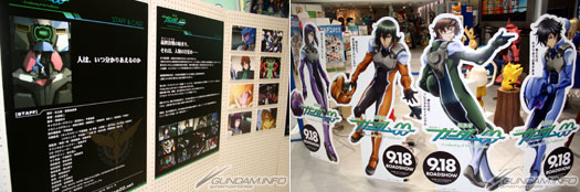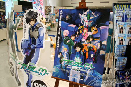 ガンダム00の軌跡を紹介するパネルや、最新アイテムを展示! オフィシャルショップではガンダム00関連のTシャツやタオル類を販売中!