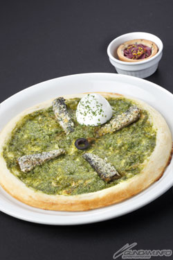 | ロックオン×アニュー オイルサーディントッピングバジルソースピザ(ロックオン)+ムラサキ芋のタルト(アニュー) |