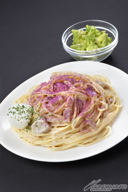 ティエリア×リボンズ 紫芋パウダーかけポルチーニパスタ(ティエリア)+ロマネスコのサラダコーンドレッシング(リボンズ) |