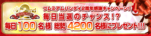 同キャンペーンは、プレミアムバンダイ会員、および期間中にプレミアムバンダイへ会員登録した人を対象に実施され、特設ページよりキャンペーンに応募すると、抽選で毎日100名に豪華賞品、またはプレミアムポイント(100P)がその場で当るというもの。