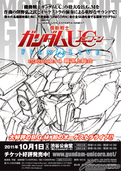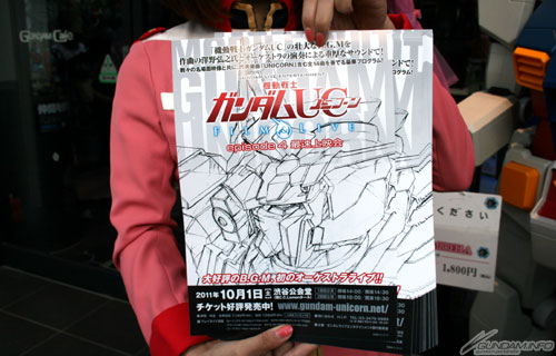 10月1日(土)に渋谷公会堂(現:渋谷C.C.Lemonホール)で開催される「GUNDAM LIVE ENTERTAINMENT 機動戦士ガンダムUC Film&Live episode 4最速上映会」。その特製チラシの配布が、秋葉原の「ガンダムカフェ」、および「魂ネイションズ AKIBAショールーム」にて開始された。